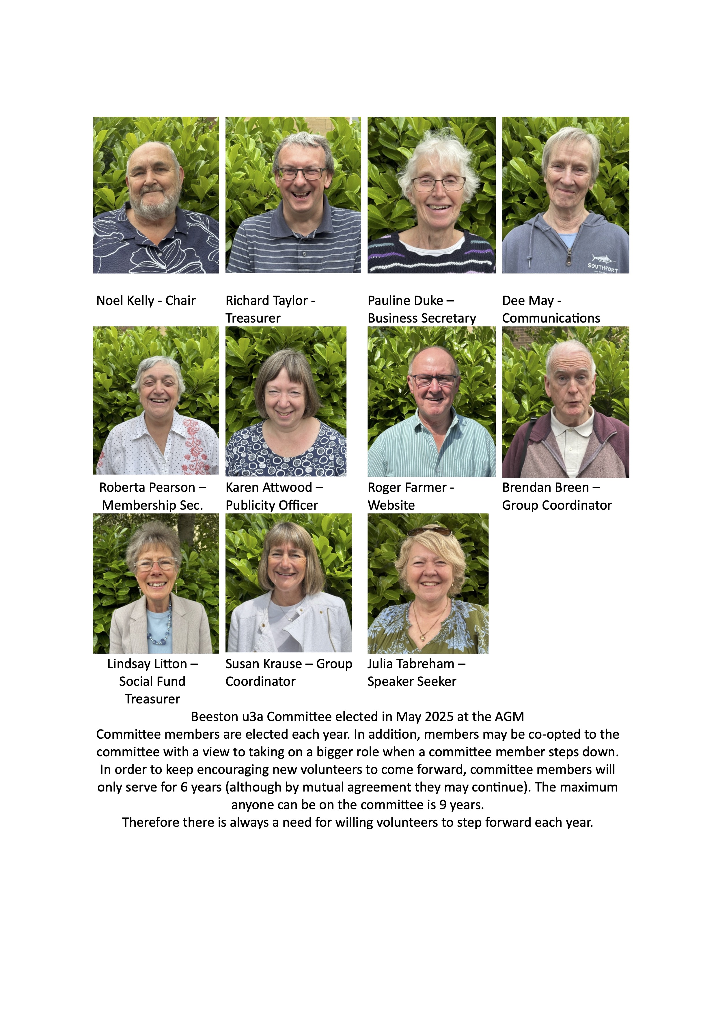 Beeston u3a committee meets every month and usually consists of 12 trustees and 3 co-opted members.