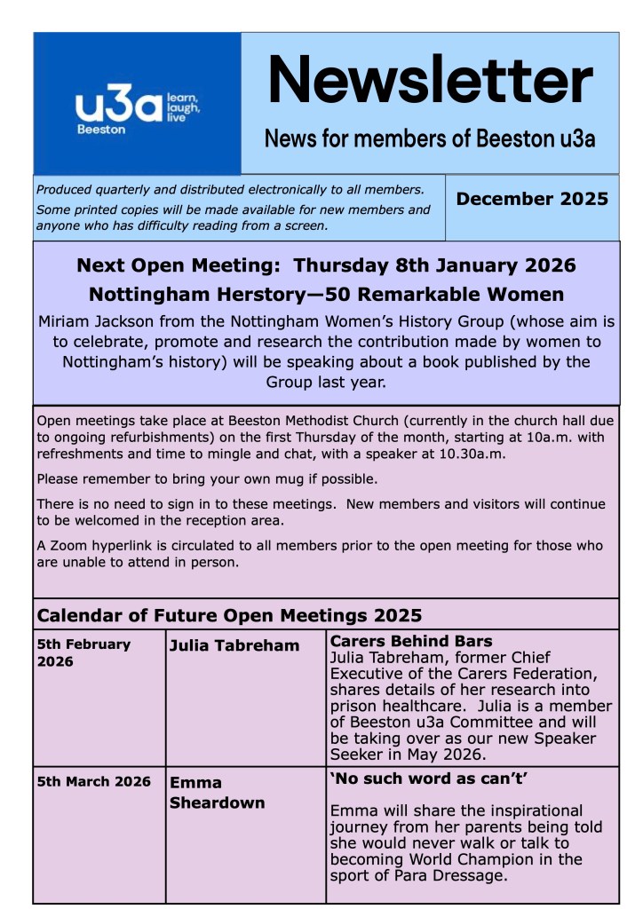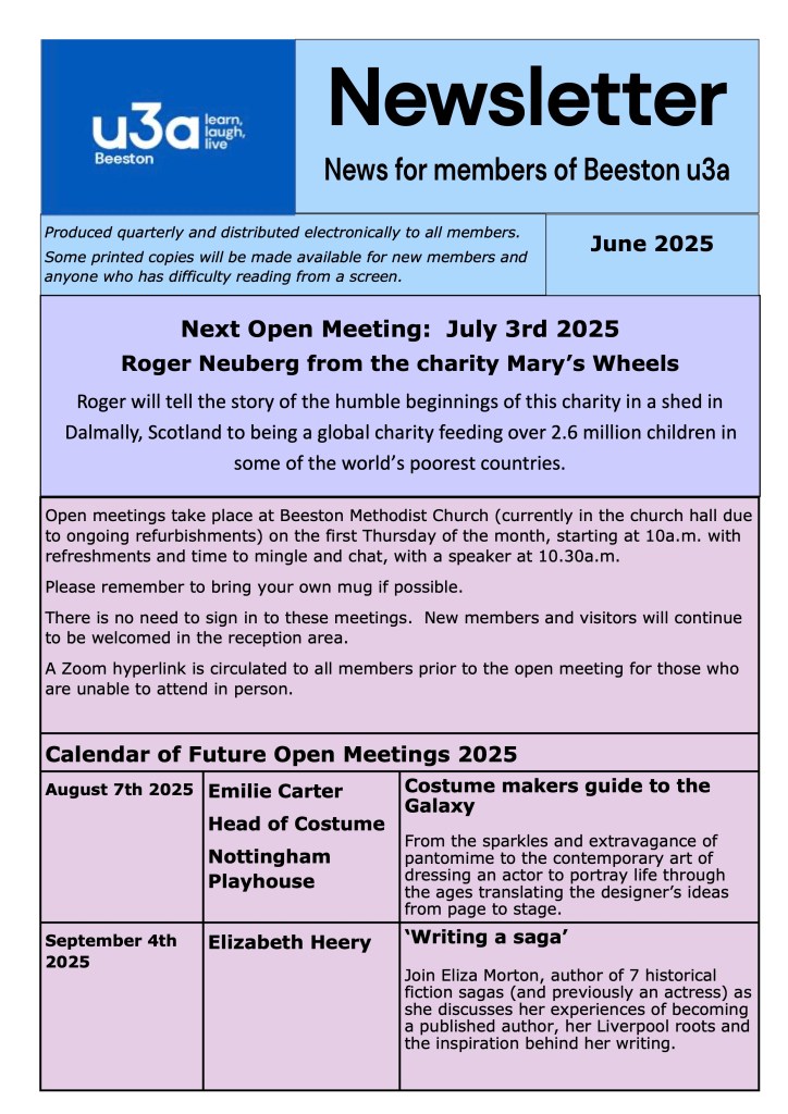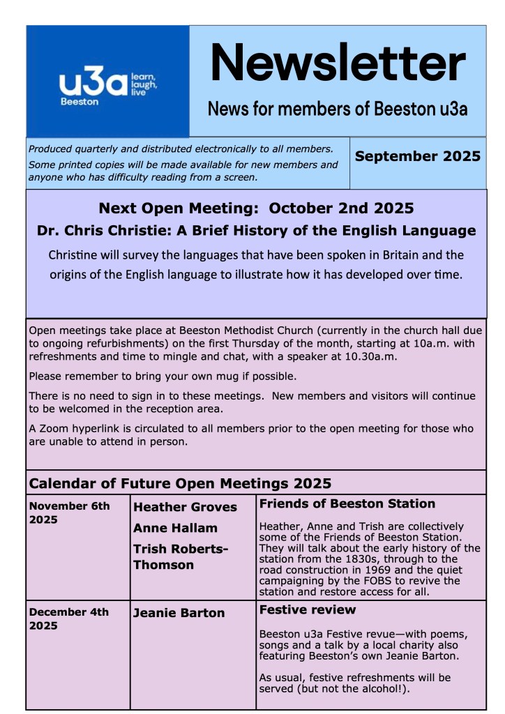 We keep members informed by our newsletter which is produced every 3 months and is sent out to members by email. For members who don’t have an email address or who struggle to read it on screen, we produce a number of printed copies which are available to pick up at the open meetings. It includes notifications from the committee and contributions from group facilitators about group activities. There is also a community notices section which provides information not related to our u3a.
